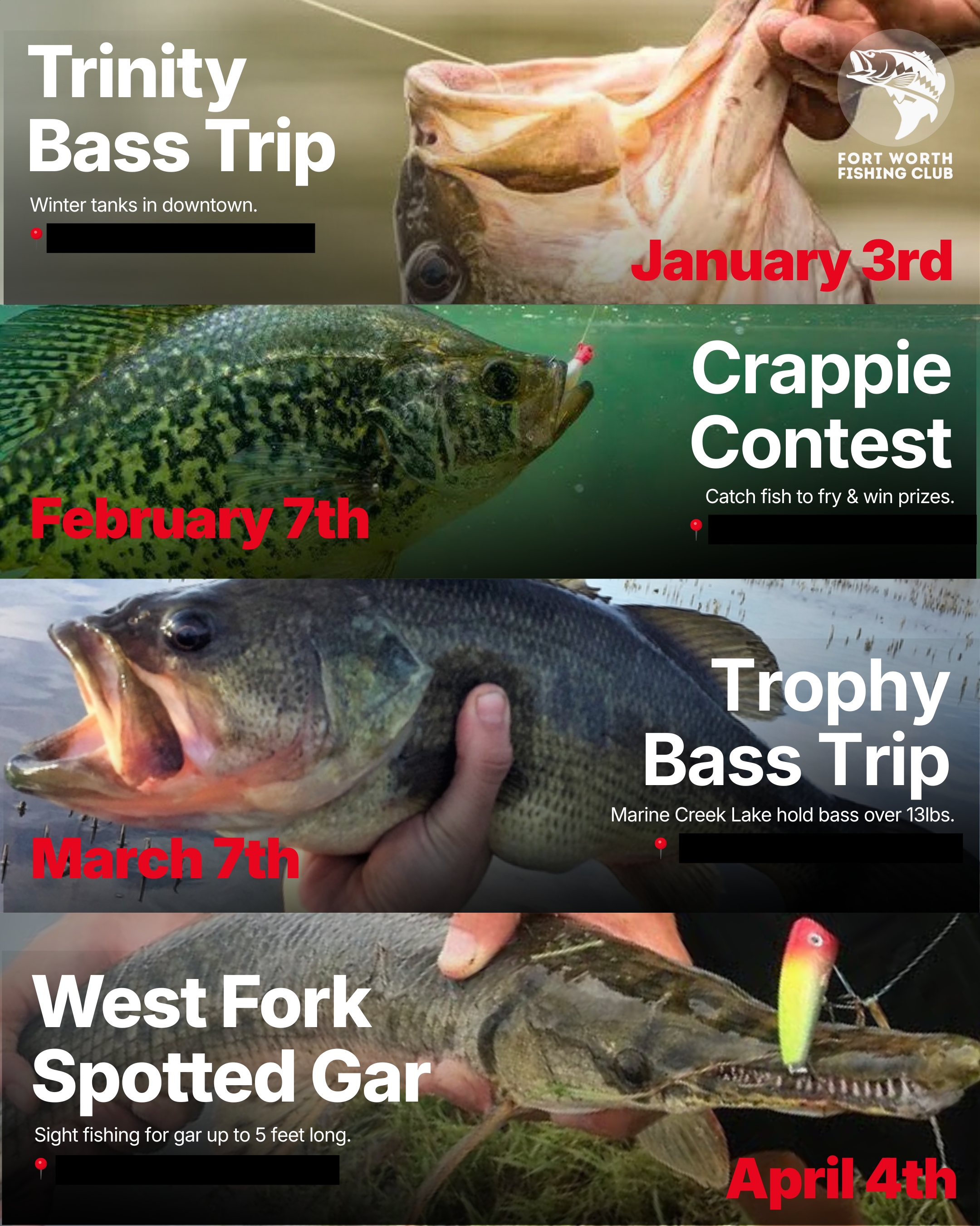 Meet local fishing buddies on group fishing trips at iconic spots around Fort Worth.